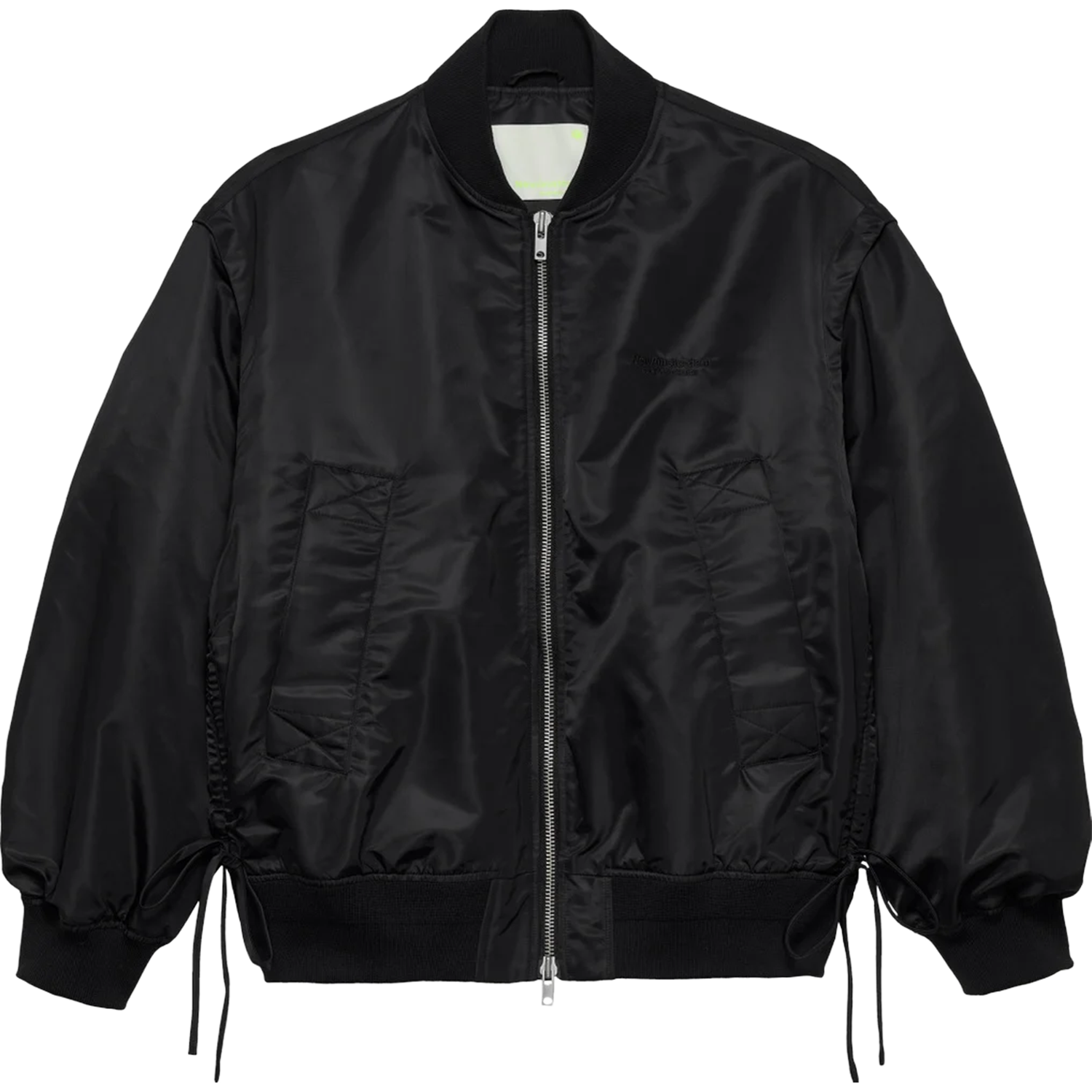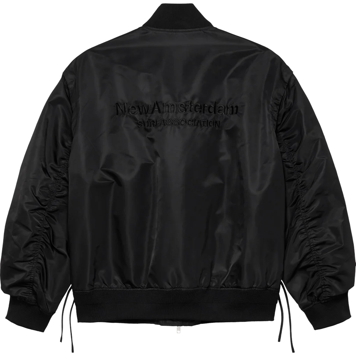 This jacket is crafted from a heavy nylon fabric and features a two-way zip closure, ribbed collar, hem, and cuffs, plus welt pockets. Designed with an oversized fit, it is finished with “New Amsterdam” logo embroidery on both the front and back. The jacket includes an adjustable drawcord at the waist for an optional cropped silhouette and comes with detachable sleeves.