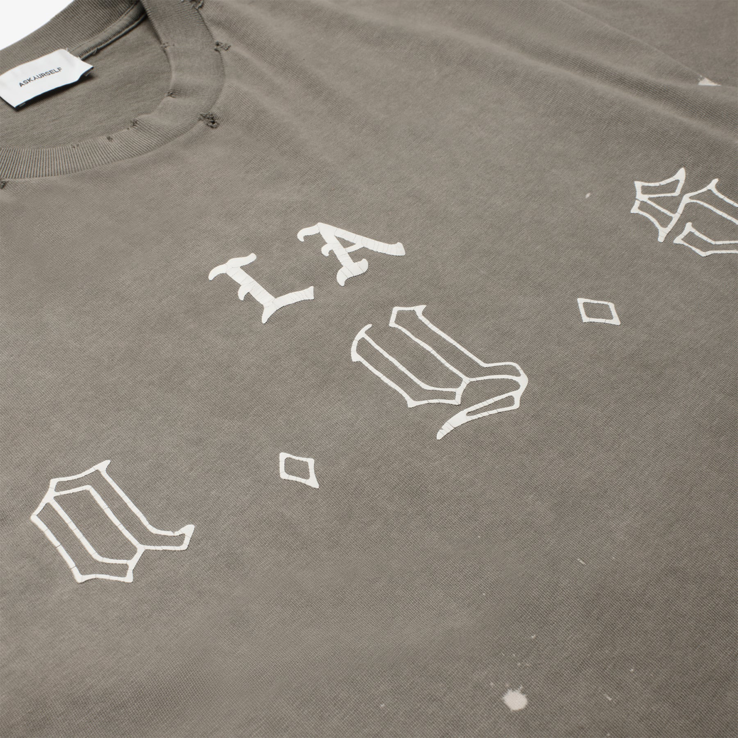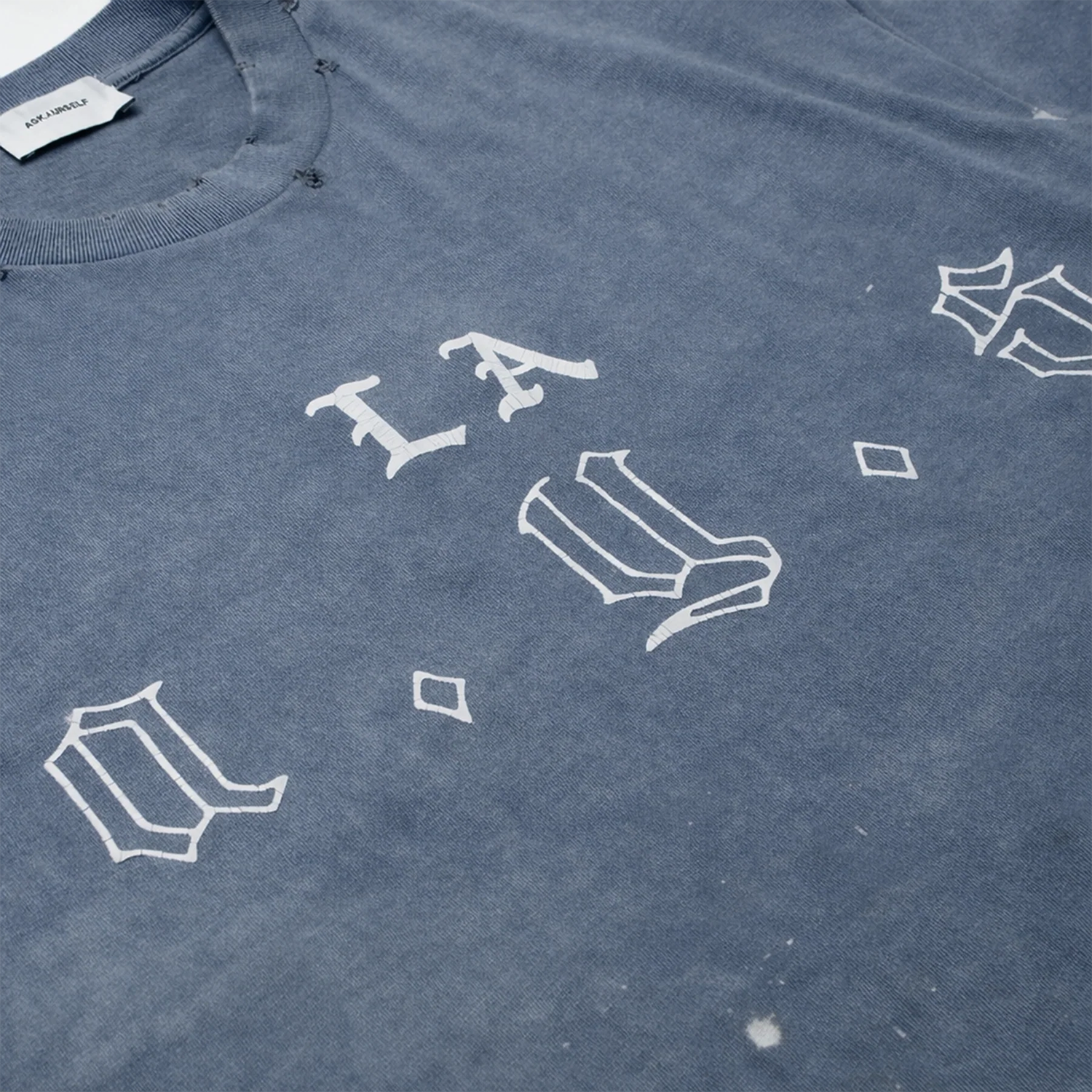 - Custom vintage fade and hand distress details
