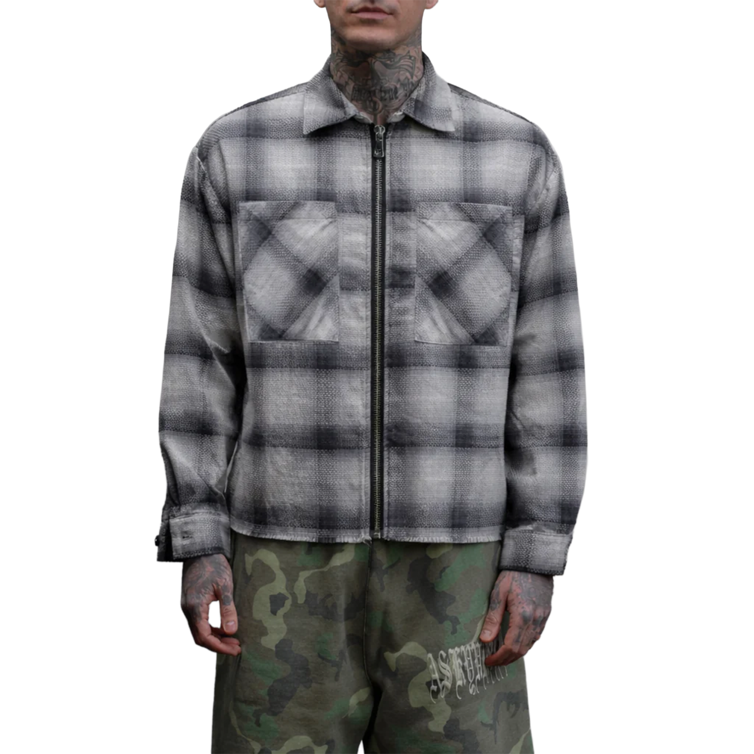 - Two oversized chest pockets