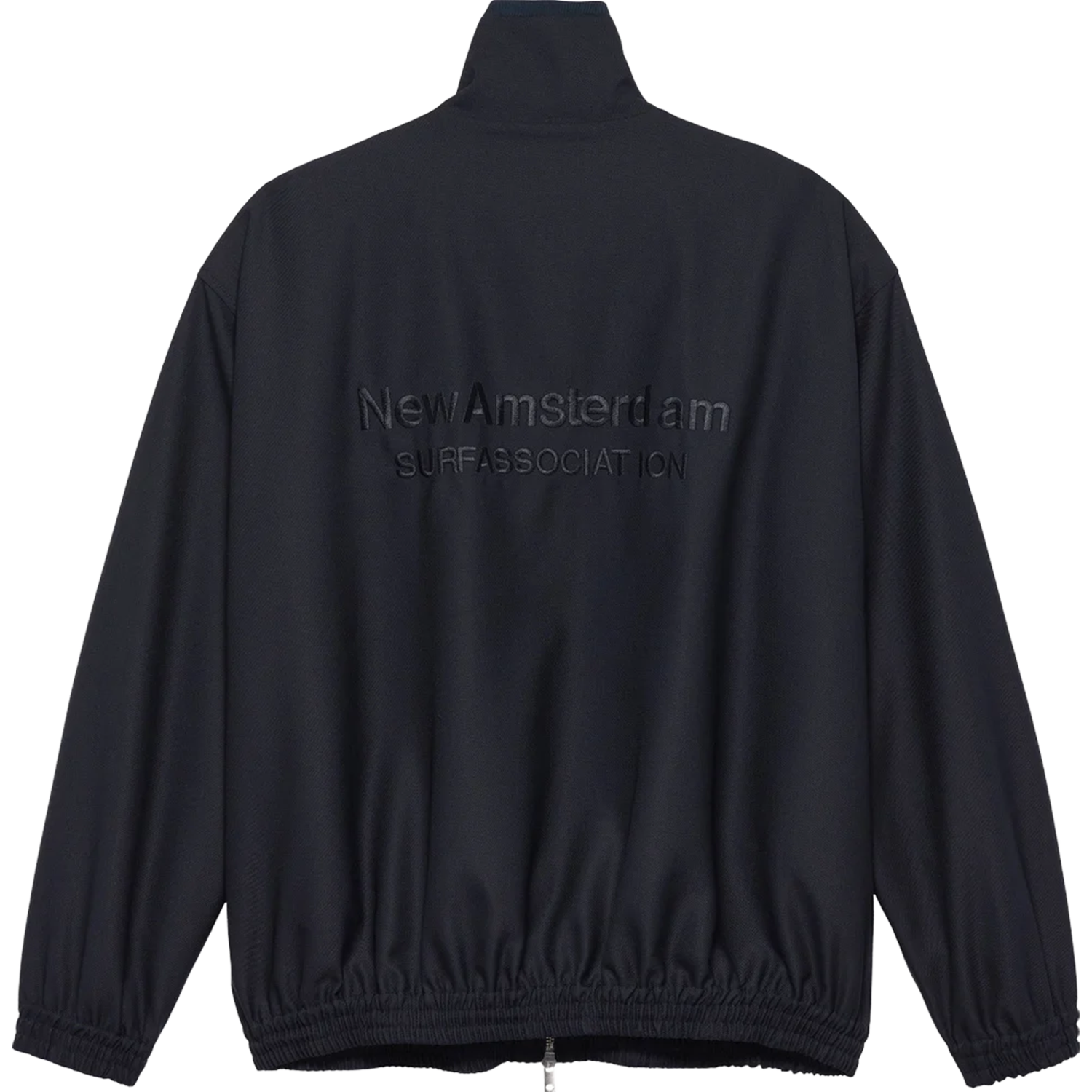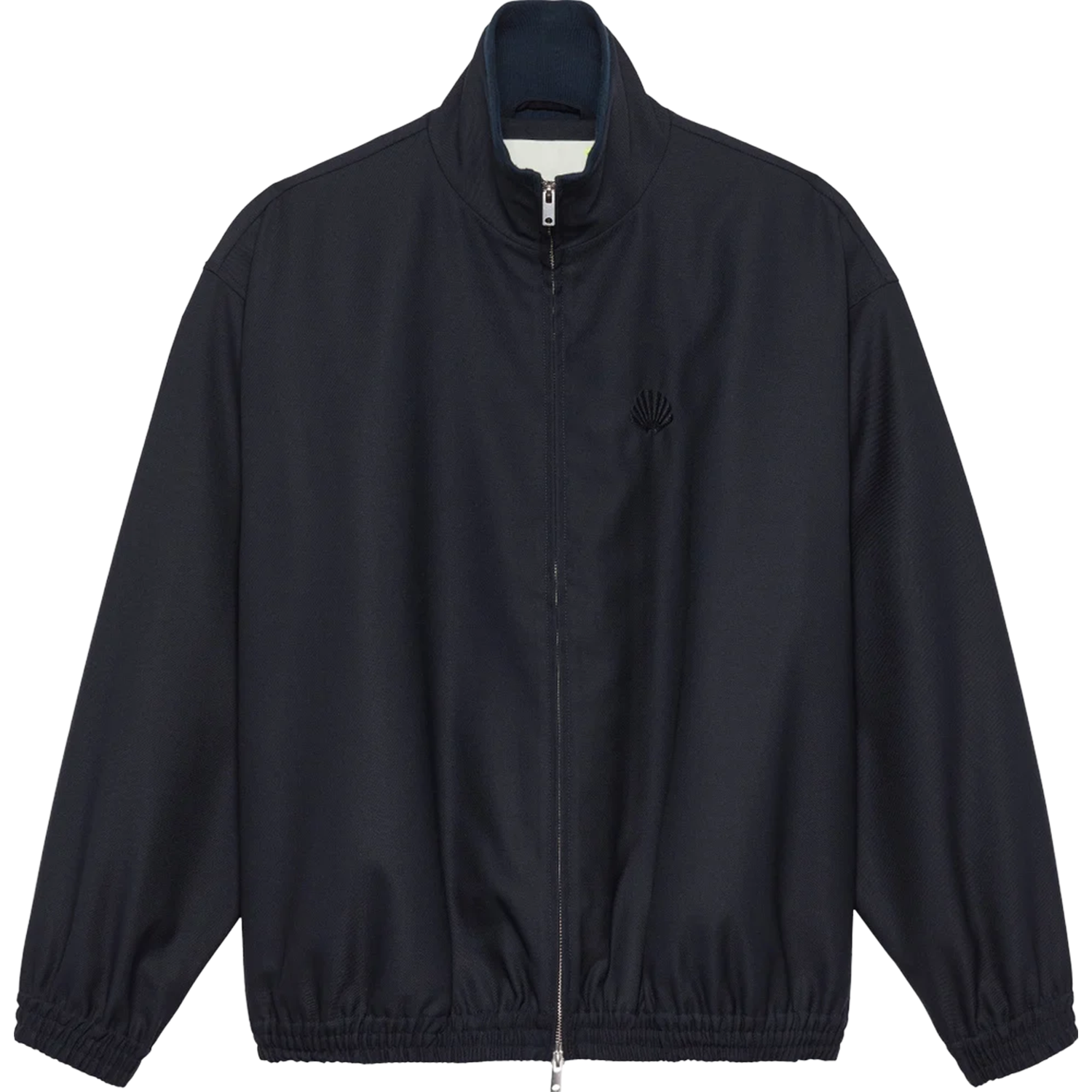 This track jacket is crafted from a rich wool-mix fabric in a deep navy tone. Designed with an oversized fit, it features a full zip-through closure with a two-way zipper, a high stand collar, and elasticated cuffs and hem. The jacket is finished with refined name embroidery on both the front and back.